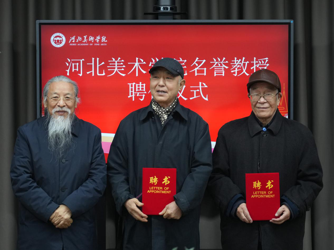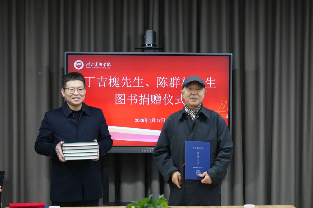 图书捐赠仪式结束后,举行了河北美术学院名誉教授聘任仪式,校长甄忠义为丁吉槐先生和陈群朴先生颁发聘任证书并合影留念。